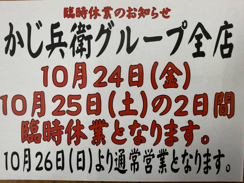 かじ兵衛グループ全店 臨時休業のお知らせ